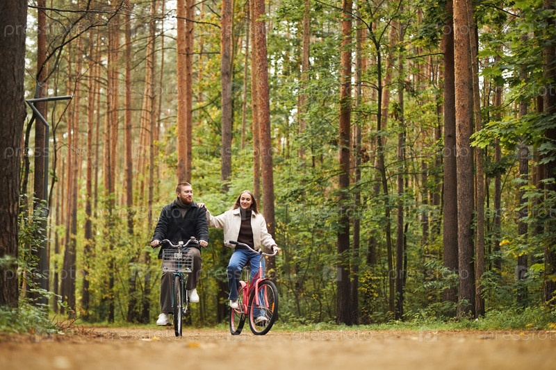 Молодой мужчина и женщина едут на велосипедах вместе по лесной тропе