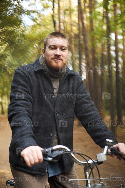 Портрет молодого взрослого мужчины, едущего на велосипеде по лесной тропе