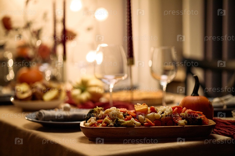 Ужин по случаю Дня благодарения на столе с жареным овощем для друзей, собирающихся