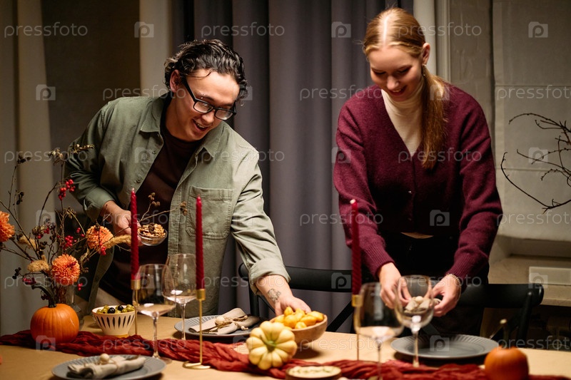 Молодая пара устанавливает обеденный стол на День благодарения вместе