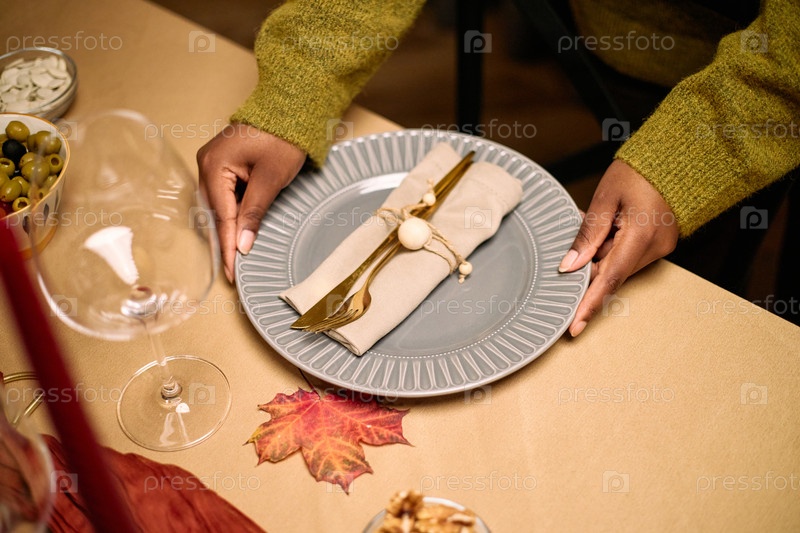 Молодая взрослая чернокожая женщина устраивает стол для Дня благодарения Ужин среди друзей
