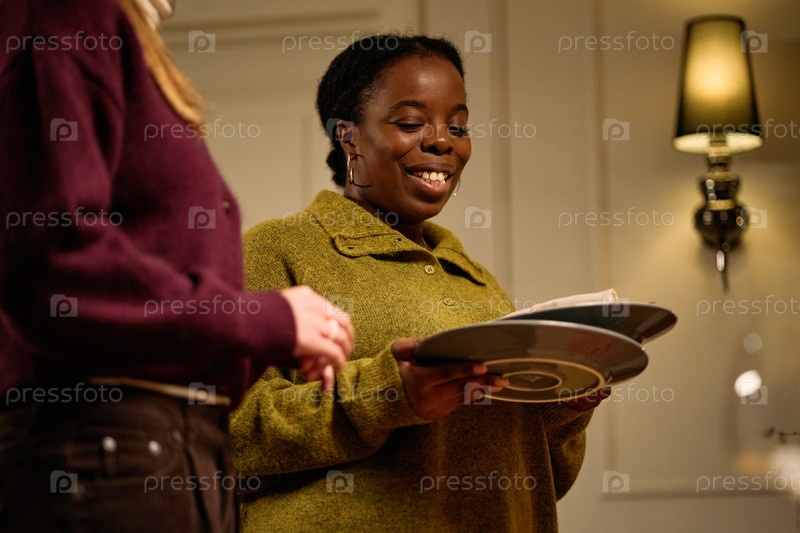 Молодая взрослая чернокожая женщина улыбается, держа тарелки во время ужина в День благодарения