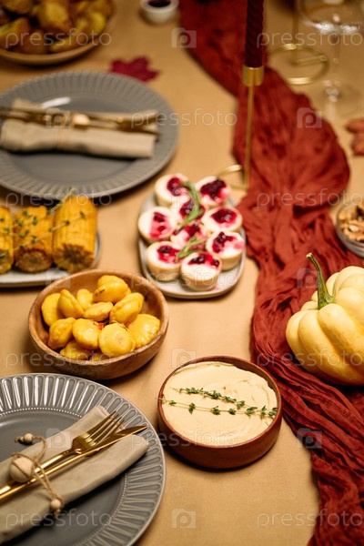 Стол для ужина в День благодарения с праздничной едой и сезонными украшениями