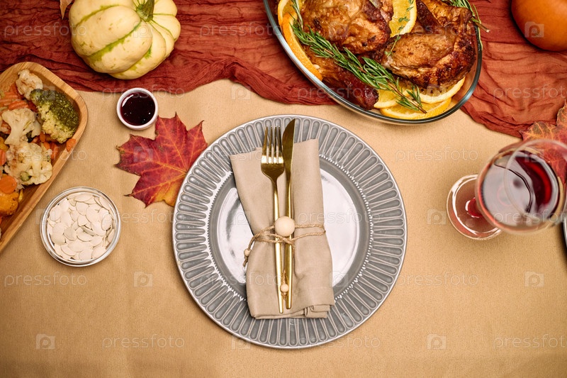 Вид над головой на праздничное установку стола в честь Дня благодарения с аранжировкой праздничной трапезы