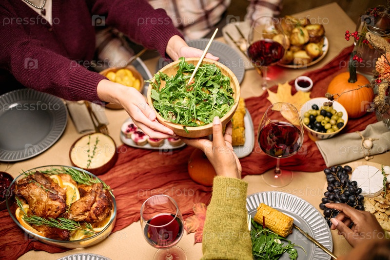 Разнообразные молодые взрослые делятся салатами во время Дня благодарения