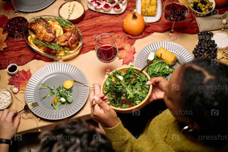 Молодая взрослая чернокожая женщина подает друзьям салат во время празднования Дня благодарения