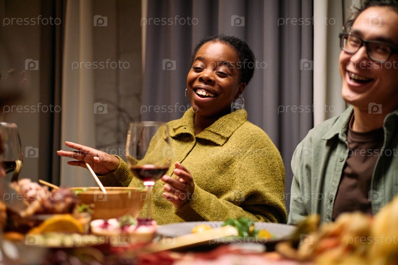 Молодые многонациональные друзья делятся ужином в День благодарения и смеются вместе