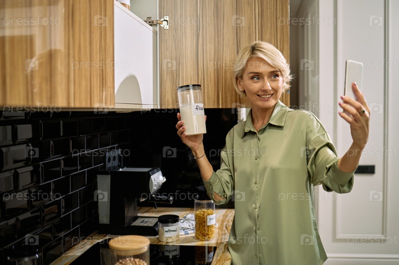 Портрет женщины среднего возраста, улыбающейся в то время как она держит кружку с мукой внутри