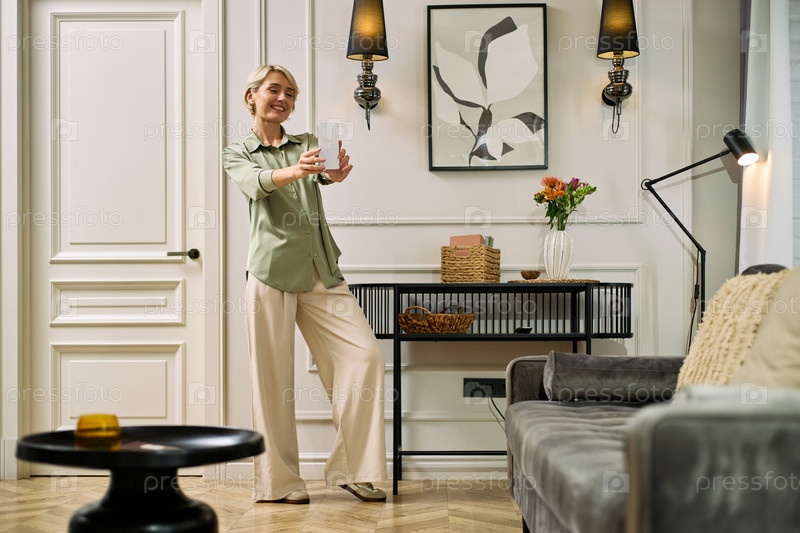 Женщина средних лет улыбается, делая селфи со смартфоном в помещении