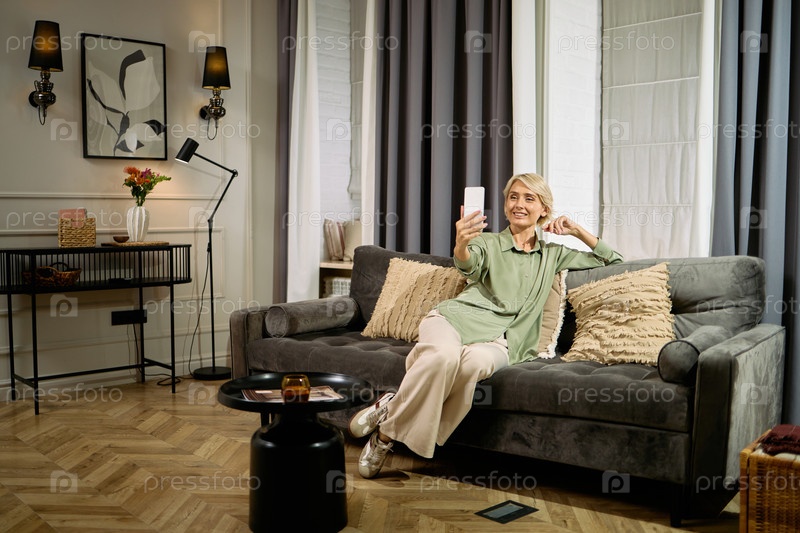 Женщина средних лет, сидящая на диване и делающая селфи со смартфоном