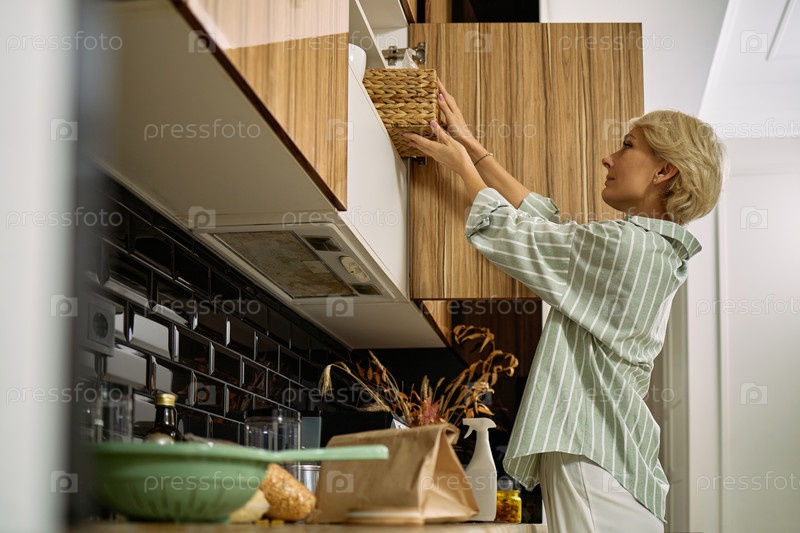 Женщина средних лет достигает корзины на полке кухонного шкафа