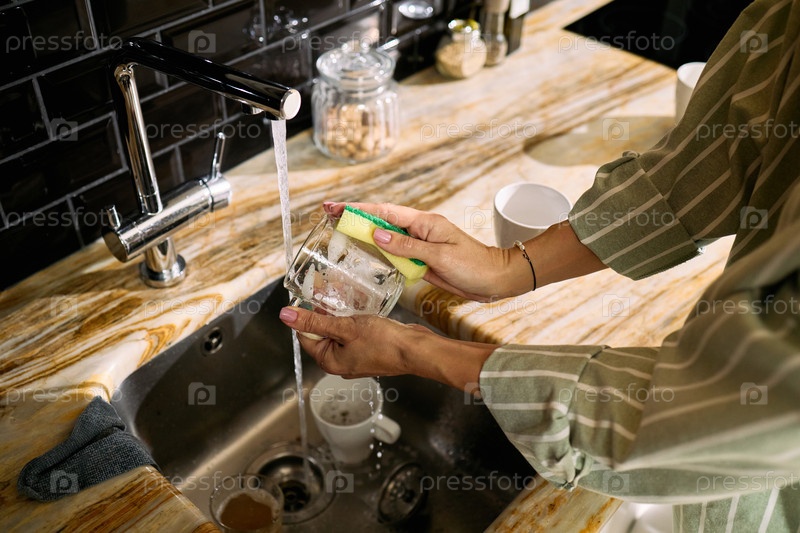 Молодая женщина моет стеклянный стакан в кухонной раковине дома