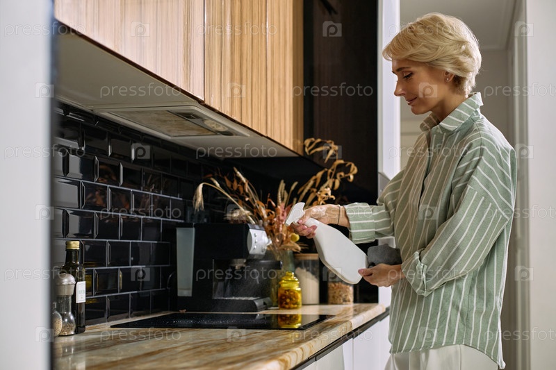 Женщина среднего возраста, убирающая кухонный стол с спрейной бутылкой