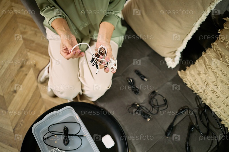 Женщина средних лет организует электронные кабели дома