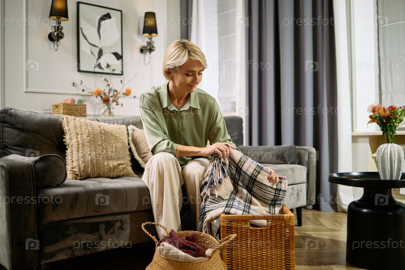 Женщина среднего возраста складывает одеяло, сидя в помещении