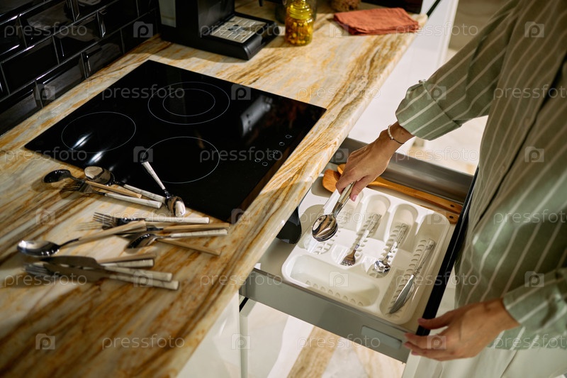 Женщина средних лет организует столовые приборы в кухонном ящике
