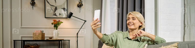 Портрет женщины среднего возраста, улыбающейся во время видеочата на диване