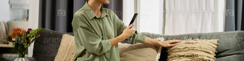 Женщина среднего возраста устраивает диванные подушки, используя смартфон