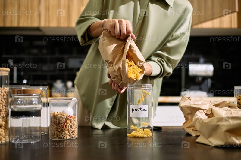 Женщина среднего возраста наливает сухую пасту в стеклянную банку для хранения