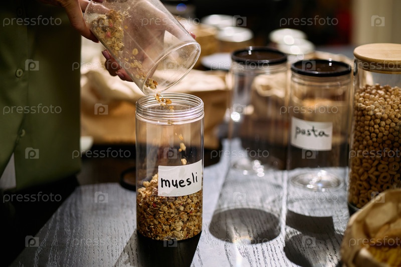Молодая взрослая женщина наливает мюсли в стеклянный контейнер для хранения