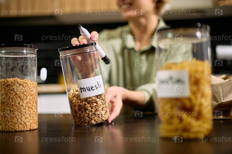Молодая взрослая женщина маркирует банку мюсли, организуя столовую