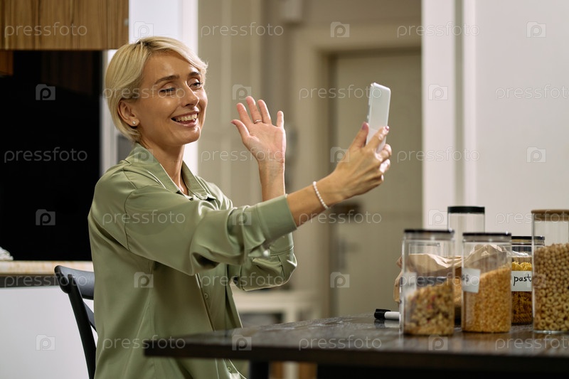 Женщина средних лет улыбается и машет во время видеозвонка