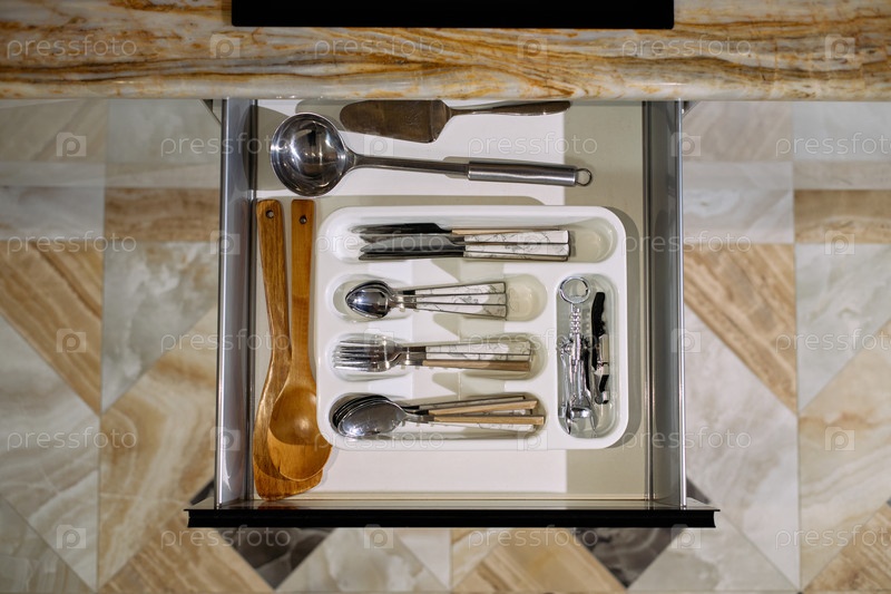 Кухонный ящик, показывающий различные приборы и столовые принадлежности, расположенные в организаторе