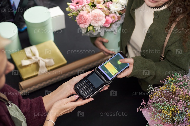 Молодая женщина платит с помощью смартфона, покупая цветы на прилавке магазина