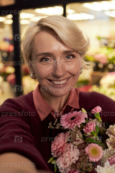 Портрет женщины среднего возраста, улыбающейся в то время как она держит букет цветов