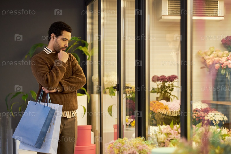 Молодой взрослый мужчина выбирает цветы в магазине, держа сумки для покупок