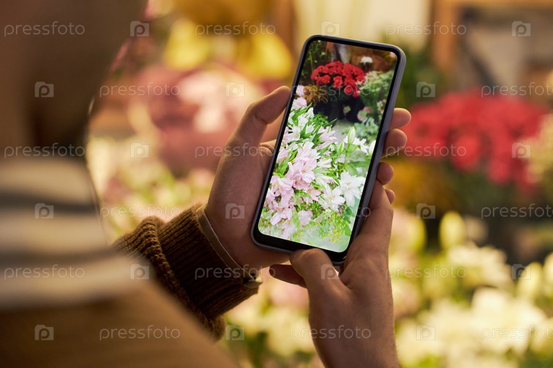 Молодой взрослый мужчина фотографирует свежую розовую и цветы со смартфоном