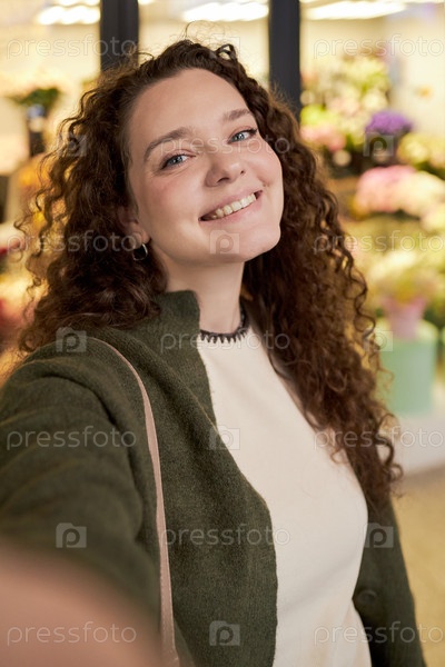 Портрет молодой взрослой женщины, улыбающейся во время фотосессии в цветочном магазине