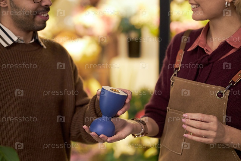 Молодая женщина вручает цветочный горшок юному мужчине с Ближнего Востока, улыбающемуся