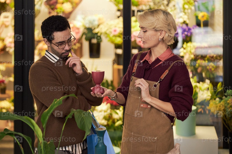 Молодая женщина показывает цветочный горшок молодому ближневосточному мужчине в помещении