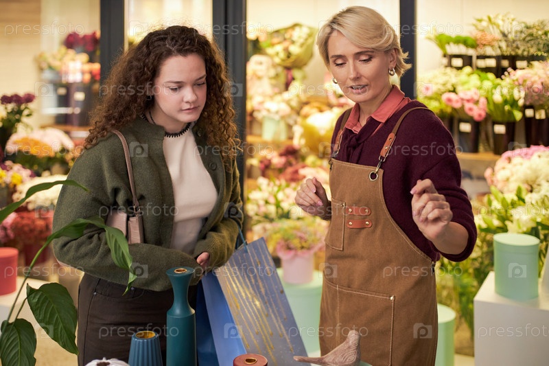 Молодая женщина и женщина среднего возраста обсуждают цветочную аранжировку