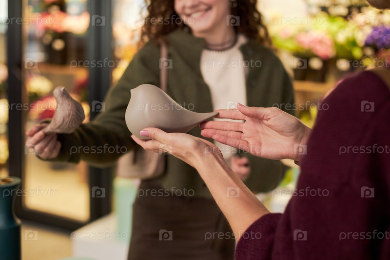 Молодая женщина передает керамическую фигуру птицы в цветочной лавке