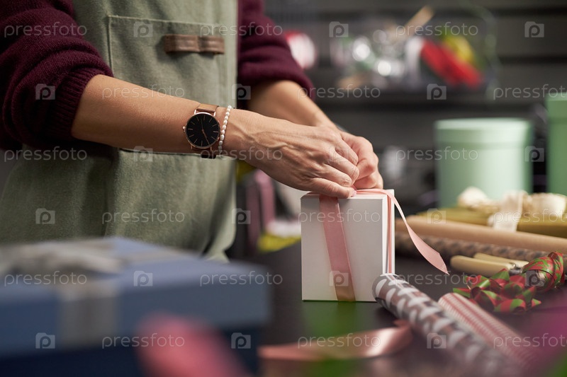 Молодая взрослая женщина связывает сатинную ленту вокруг коробки для подарков в цветочном магазине