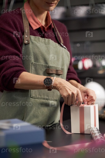 Женщина среднего возраста украшает подарочную коробку с атласной лентой в цветочном магазине