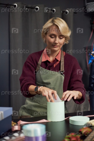 Молодая взрослая женщина устраивает цветы в коробке для подарков на флоральной мастерской