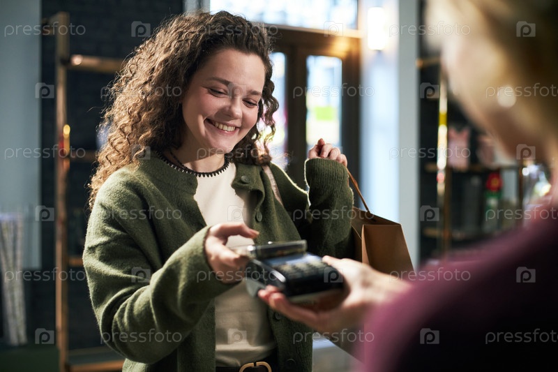 Молодая женщина улыбается, оплачивая с помощью смартфона на стойке цветочного магазина