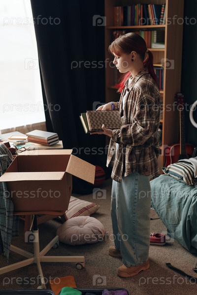 Девушка-подросток сортирует книги и личные вещи в спальне