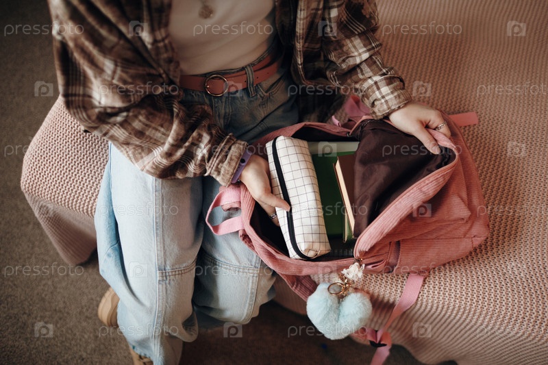 Подростковая девочка упаковывает школьные принадлежности в рюкзак в спальне