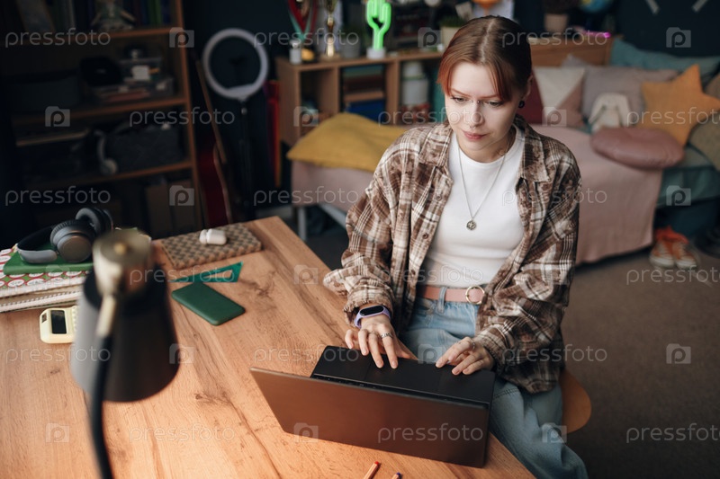 Девушка-подросток, сидящая за рабочим столом и использующая ноутбук в уютной обстановке спальни