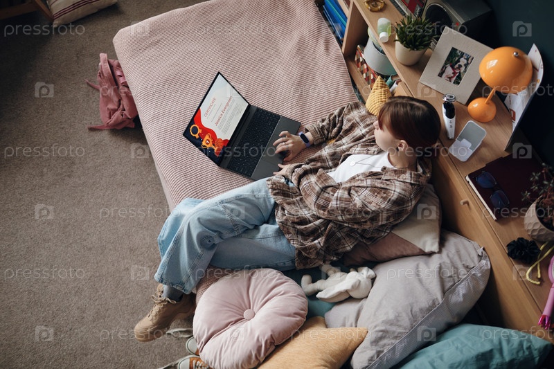 Девушка-подросток отдыхает на кровати после занятий в колледже