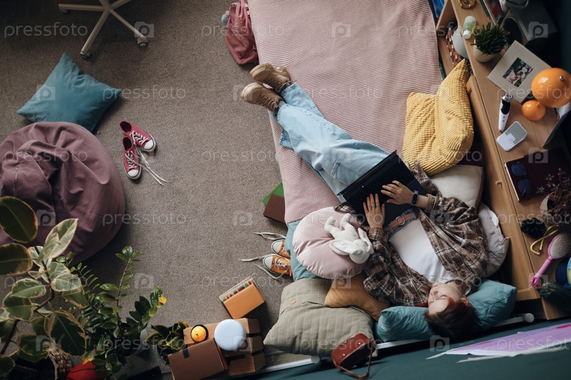 Девушка-подросток отдыхает в постели, используя ноутбук в уютной обстановке спальни