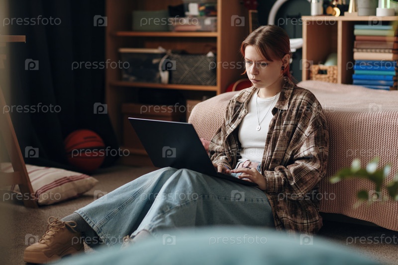 Девушка-подросток, сидящая на полу с помощью ноутбука для школьной работы в комнате