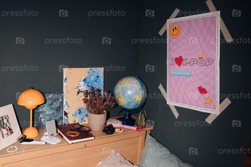 Интерьер спальни подростков с плакатом K Pop и личными принадлежностями