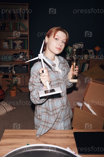 Портрет девочки-подростка, держащей модель и трофей ветряной турбины