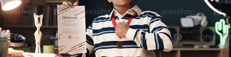 Заголовок подросткового мальчика, показывающего сертификат и носящего медаль в комнате