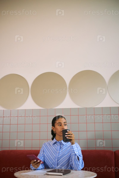 Молодая взрослая чернокожая женщина использует смартфон и пьёт кофе в деловой среде